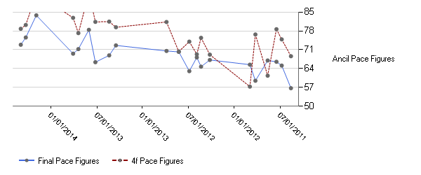 His last three sets of Pace Figures are 81.2/75.8 – 79.4/68.5 - 74.8/59.6, and show increases in both 4f and Final Figure while still maintaining a six point turf spread (difference between final and 4 figure). The 80.5 in June of last year solidifies the 81.2 as a reasonable final figure.